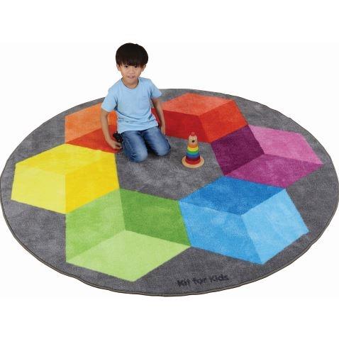 This bright circular rug is ideal for libraries and classrooms. Thick, soft textured man-made pile.