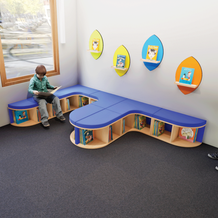 Give your Cubby seating layout the perfect finish with this curved end seat. Use with other seats from the Cubby seating range to build shaped seating configurations as shown in the second image. The seats have comfy upholstered tops and book storage beneath, making them the ideal solution in libraries and classrooms with limited space. Right end seat also available.