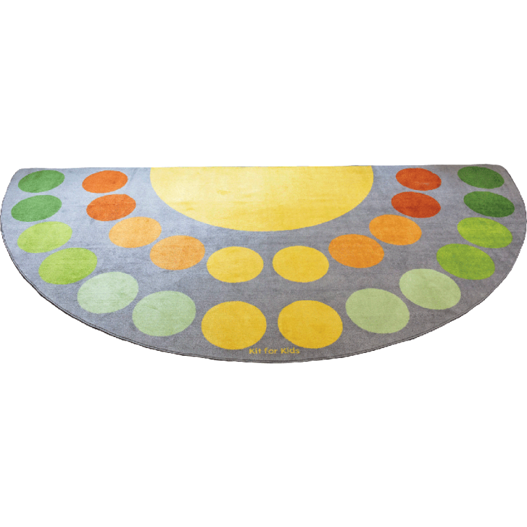This large semi-circular rug in a warm and vibrant safari-inspired colour palette is perfect for seating large groups of children for storytime or carpet time. It has a thick and soft textured man-made pile making it a super-cosy place to sit.