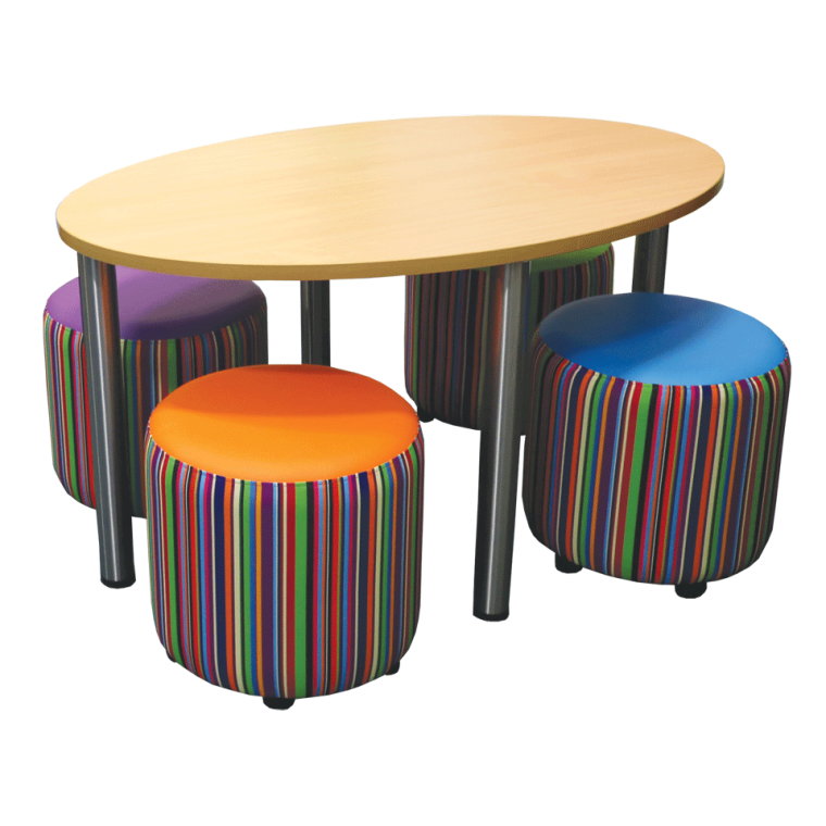 Perfect for smaller group work and breakout areas, this compact table kit includes an oval table on sturdy chrome legs and 4 upholstered Buzz Drum seats. Available in our usual range of bright colours and patterned accent fabrics to complement your room scheme.