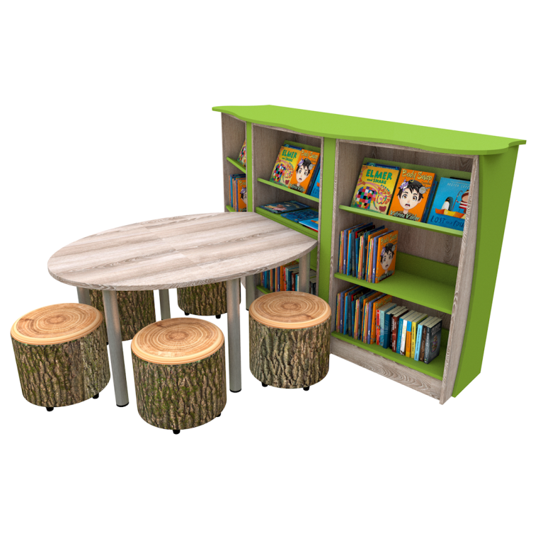 Bring an outdoors-in feel to your breakout space or library with this fantastic space-saving study pod with woodland styling. Featuring shelving for up to 400 books, a work table and 5 Woodland drum seats.